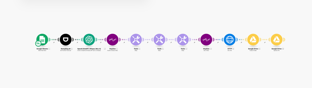 • Key Tools: Google Sheets, Dumpling AI (YouTube transcript), OpenAI (content generation), HeyGen (video creation), and Google Drive (file storage).
